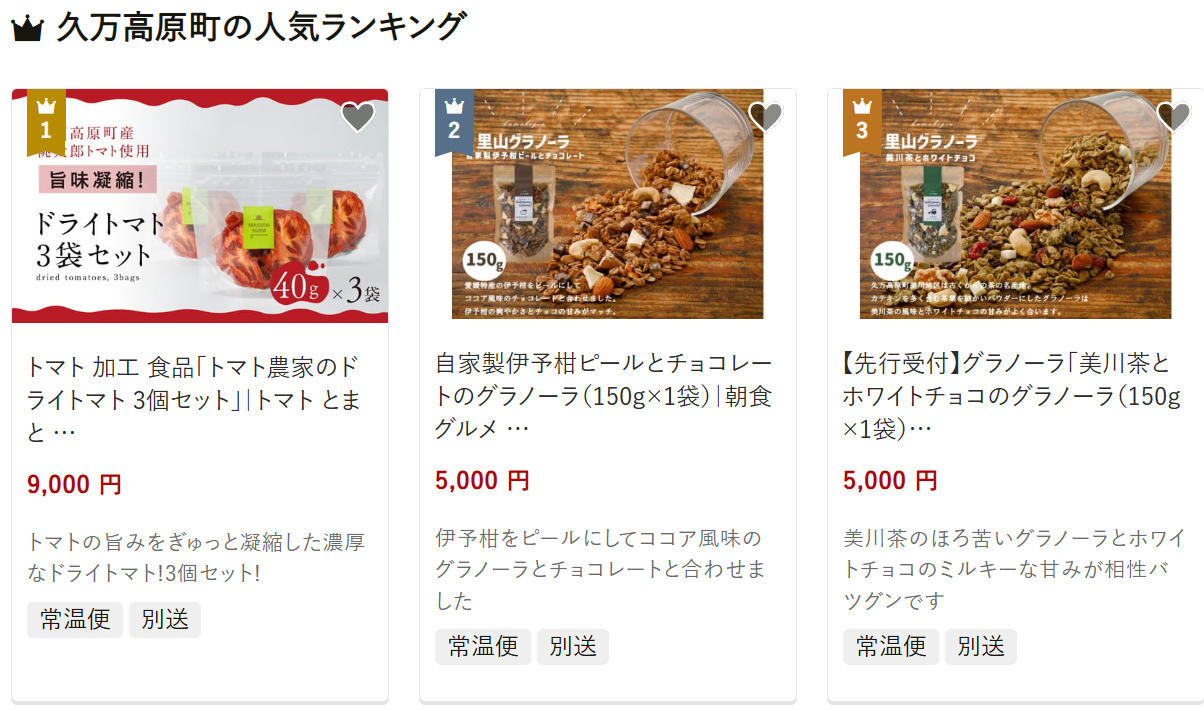 特に評判の高い返礼品のひとつが、標高1000mを超える高原地帯の昼夜の寒暖差を活かして育ったトマトを濃縮したドライトマトです。このほかにも、瀬戸内で育った伊予柑の皮を使用したココア風味のグラノーラや、香り豊かな美川産の緑茶パウダーを練り込んだグラノーラも、多くの方に選ばれています。